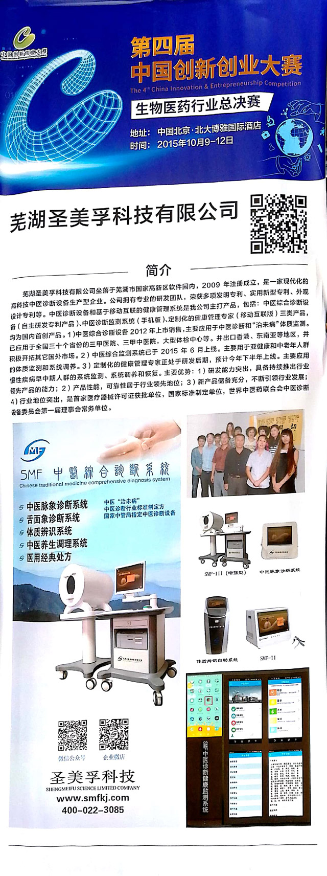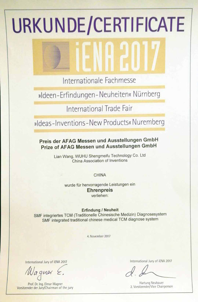 2015年,“中醫(yī)脈象診斷系統(tǒng)”、“SMF中醫(yī)舌面象儀”兩項(xiàng)產(chǎn)品入選全國衛(wèi)生產(chǎn)業(yè)管理協(xié)會首批“治未病服務(wù)適宜設(shè)備”;