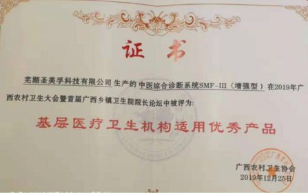 在此次大會(huì)上,蕪湖圣美孚科技有限公司生產(chǎn)的中醫(yī)綜合診斷系統(tǒng)SMF-Ⅲ(增強(qiáng)型)在2019年廣西農(nóng)村衛(wèi)生大會(huì)暨首屆廣西鄉(xiāng)鎮(zhèn)衛(wèi)生院院長(zhǎng)論壇中被評(píng)為“基層醫(yī)療衛(wèi)生機(jī)構(gòu)適用產(chǎn)品”。